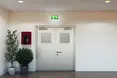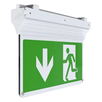 Modern, slim, 5-In-1 self-test emergency LED Exit Sign with either suspension, recessed, or side arm wall mounting options. Supplied with 1m cable. Viewing distance 25 metres.