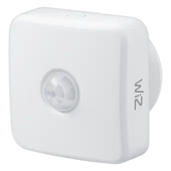 IP65 WiFi-enabled PIR sensor for residential/small commercial use. Works with all OCTO Connected by WiZ devices. Infrared PIR and photocell with strong/secondary zones. Battery-powered (2x AA, not included) with 1-year life. Max 15m from fitting. Light level monitoring via Alexa app only.