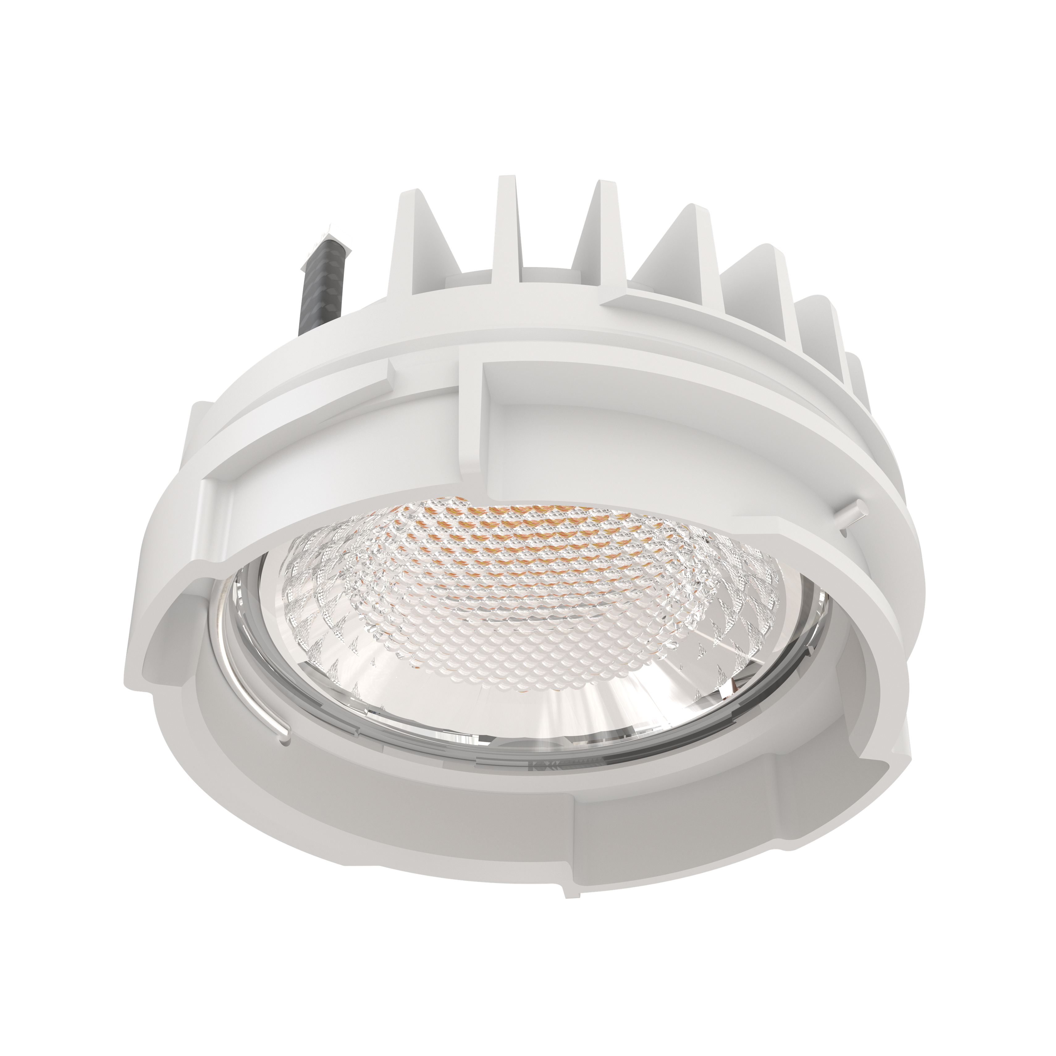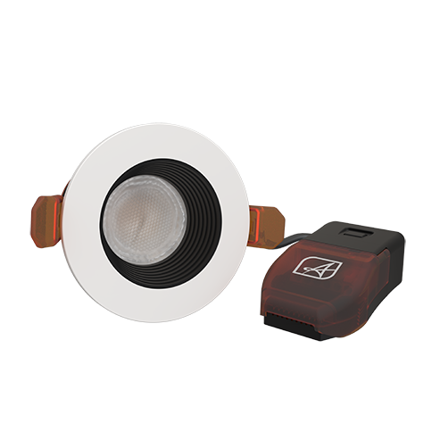 Modular, patent-applied design with replaceable engine and driver extends life and cuts waste. IP65 dimmable CCT fire-rated anti-glare downlight with two power outputs, low-profile fit and anti-glare design. Detachable connector and fast-fit plug speed install. Supplied with matt white bezel. Tested to Parts C, E and L