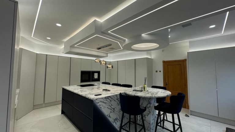 El proyecto terminado proporciona una integración perfecta del diseño de iluminación moderno en el entorno de una cocina residencial. La tira LED empotrada en pladur ofrece una estética elegante y contemporánea, mientras que los focos empotrados Prism Pro garantizan una iluminación brillante y uniforme para el uso diario.