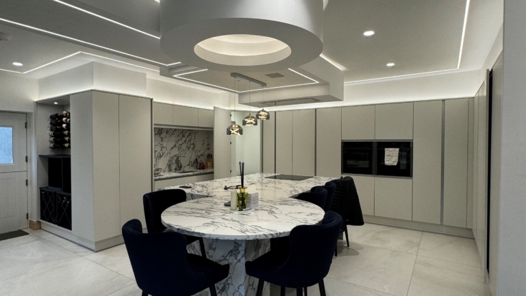 Se renovó una cocina contemporánea utilizando la tira LED E-Cell IP20 de Ansell con perfil empotrable para crear un llamativo elemento decorativo en el techo, combinado con downlights Prism Pro CCT intumescentes para una iluminación funcional de alto rendimiento. El resultado es un esquema de iluminación moderno, flexible y energéticamente eficiente que mejora tanto la estética como la funcionalidad del espacio.